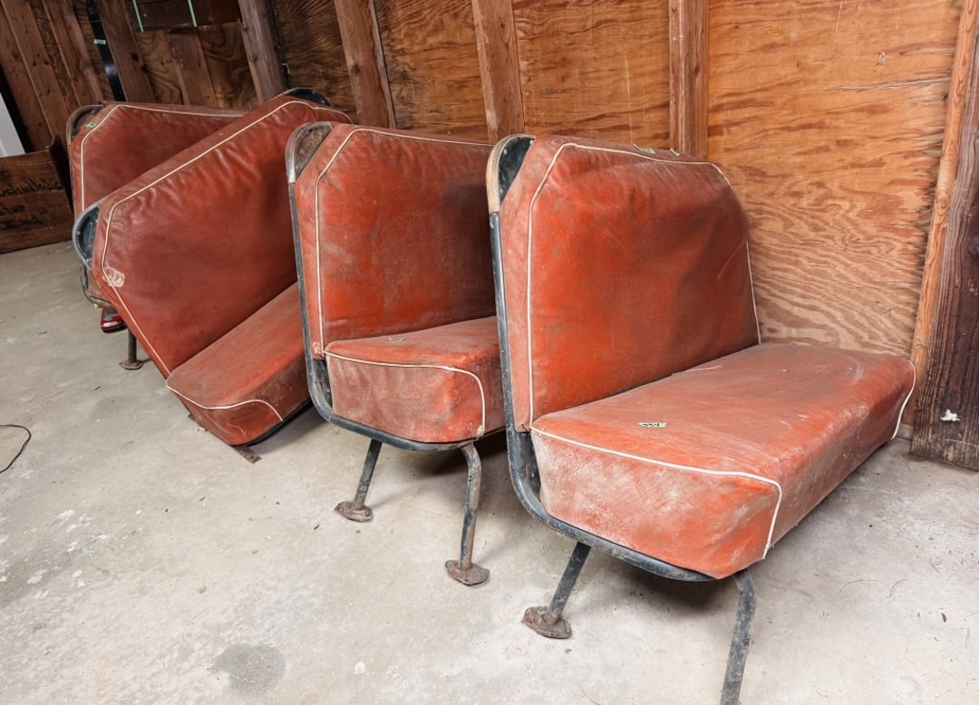 •(4) Vntg Blue Bird bus benches. (Lot #334)