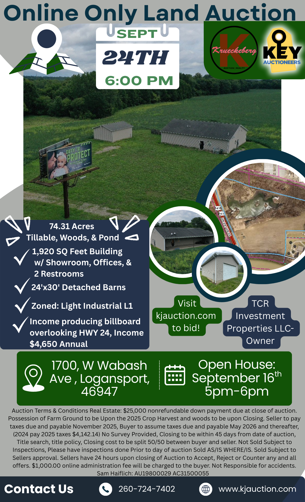 Auction Terms & Conditions Real Estate: $25,000 nonrefundable down payment due at close of auction. Possession of Farm Ground to be Upon the 2025 Crop Harvest and woods to be upon Closing. Seller to pay taxes due and payable November 2025, Buyer to assume taxes due and payable May 2026 and thereafter, (2024 pay 2025 taxes $4,142.14) No Survey Provided, Closing to be within 45 days from date of auction, Title search, title policy, Closing cost to be split 50/50 between buyer and seller. Not Sold Subject to Inspections, Please have inspections done Prior to day of auction Sold AS/IS WHERE/IS. Sold Subject to Sellers approval. Sellers have 24 hours upon closing of Auction to Accept, Reject or Counter any and all offers. $1,000.00 online administration fee will be charged to the buyer. Not Responsible for accidents. Sam Haiflich:AU19800029 AC31500055