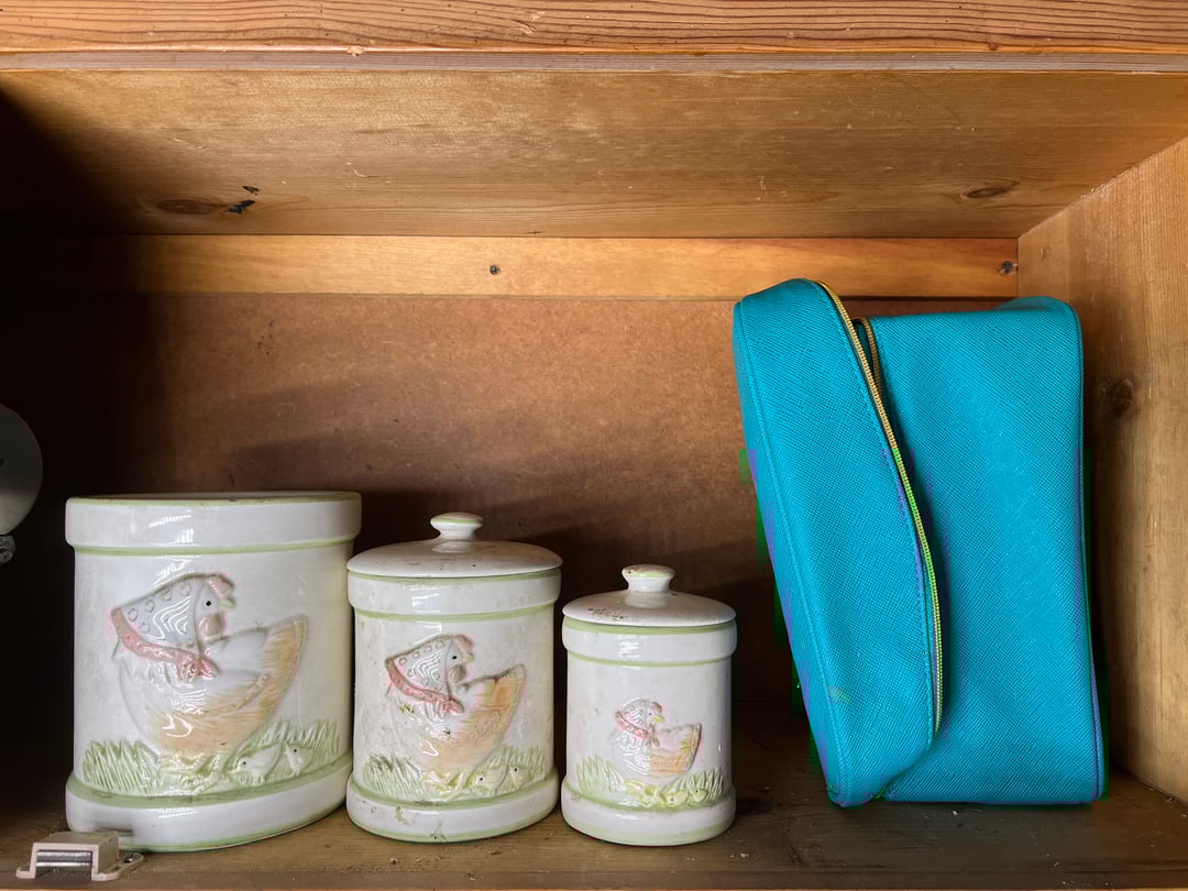 •(3) Vintage Nesting Hen Canisters, Soft Jewelry Case (Lot #20b)