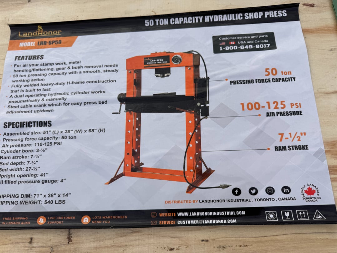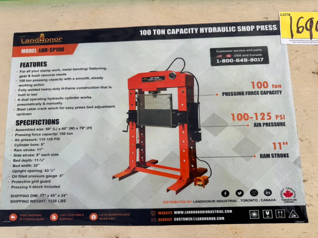 •Land Honor LHR-SP100 100 Ton Hydraulic Shop Press (Lot #700)