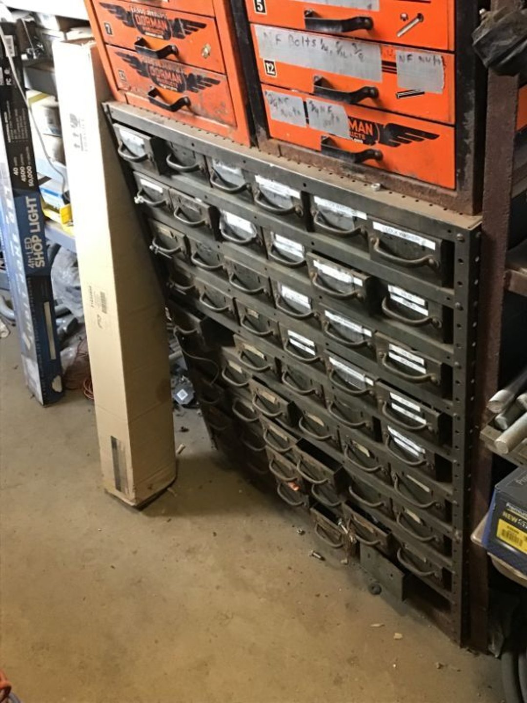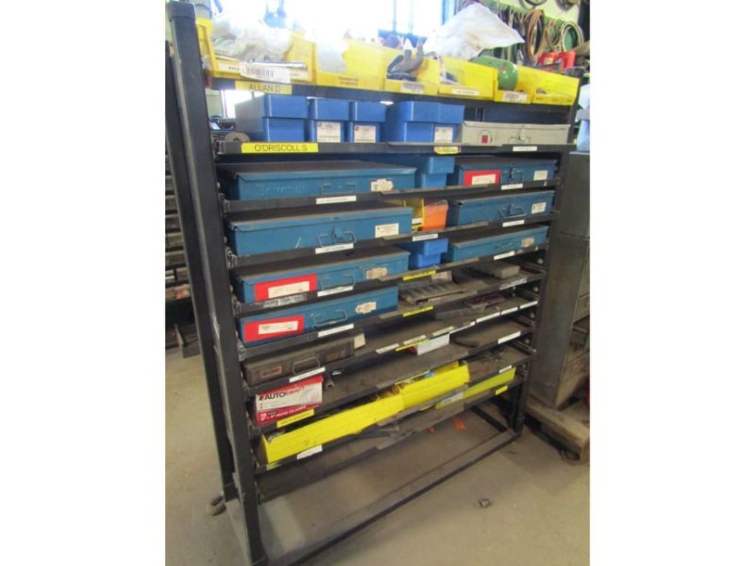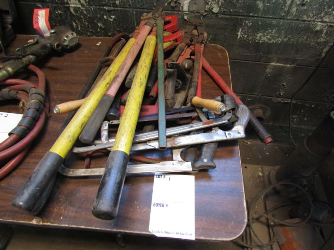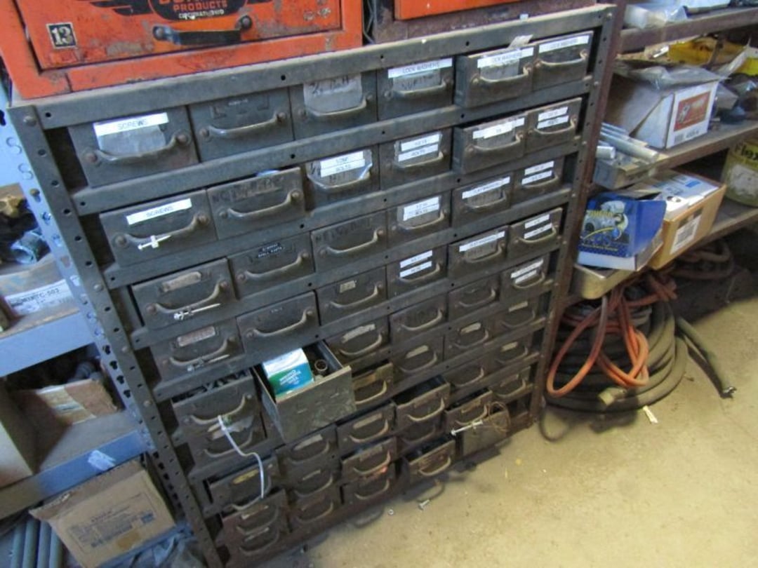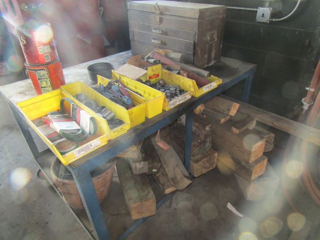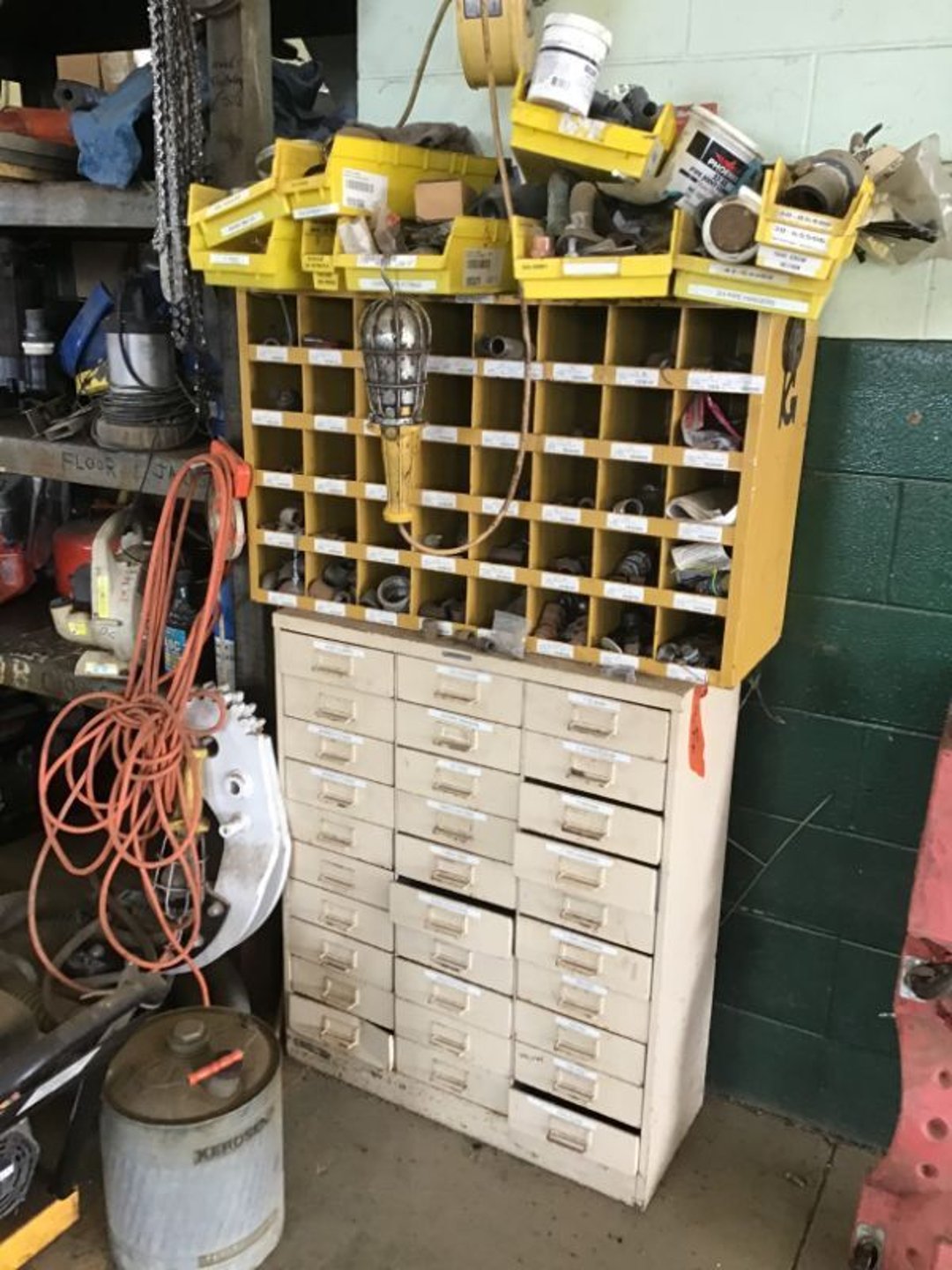 SHOP EQUIPMENT, PARTS BINS, PRESSES, SAWS, HAND TOOLS, COMPACTORS