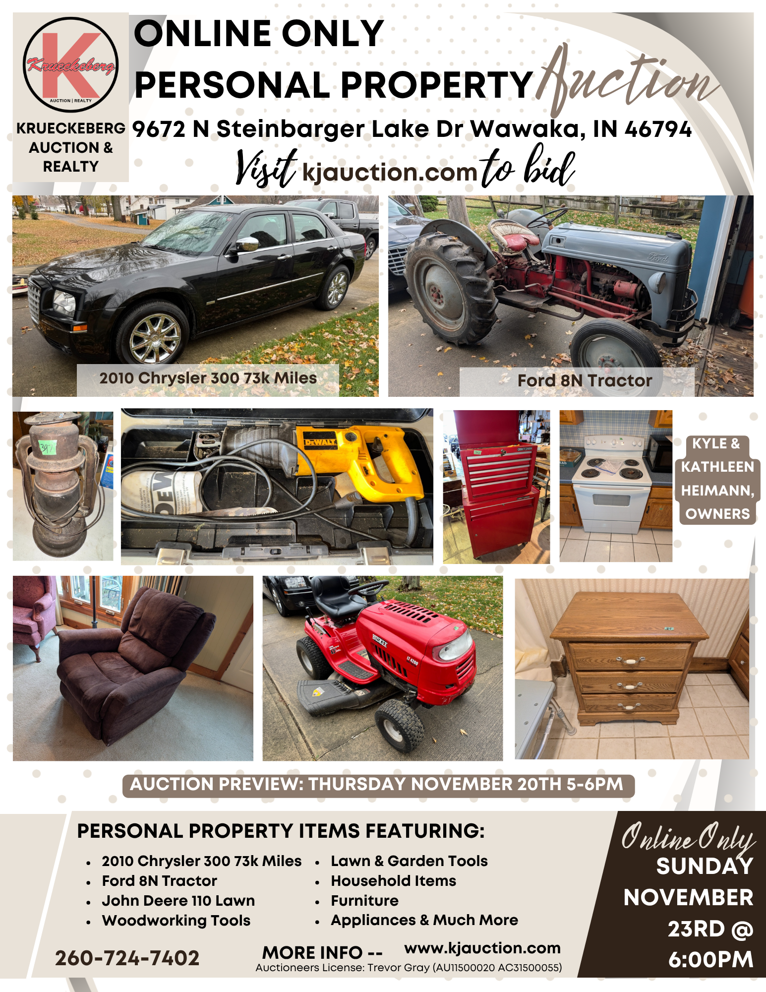 Terms & Conditions Personal Property: Items Located in Wawaka, IN. All descriptions believed accurate but not warranted. * By placing a bid, bidder signifies that they have examined the items to their satisfaction, or that they have chosen not to personally examine them. * All Items Sold AS-IS no warranty guaranteed! * The auction company reserves the right to reject any bid at our sole discretion. * 15% Buyers Premium on a PER ITEM basis, $35 Title processing fee PER TITLED ITEM, Payments accepted: Credit cards will automatically be charged at the conclusion of the auction, All statements made the day of auction take precedence over all written matter. All Removal of items are at the buyers risk, NOT RESPONSIBLE FOR ACCIDENTS) Kyle & Kathleen Heimann , Owners Auctioneers License: Trevor Gray (AU11500020 AC31500055)
