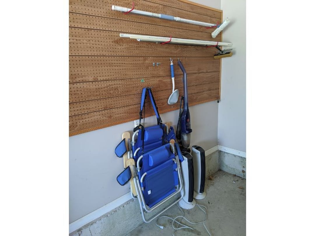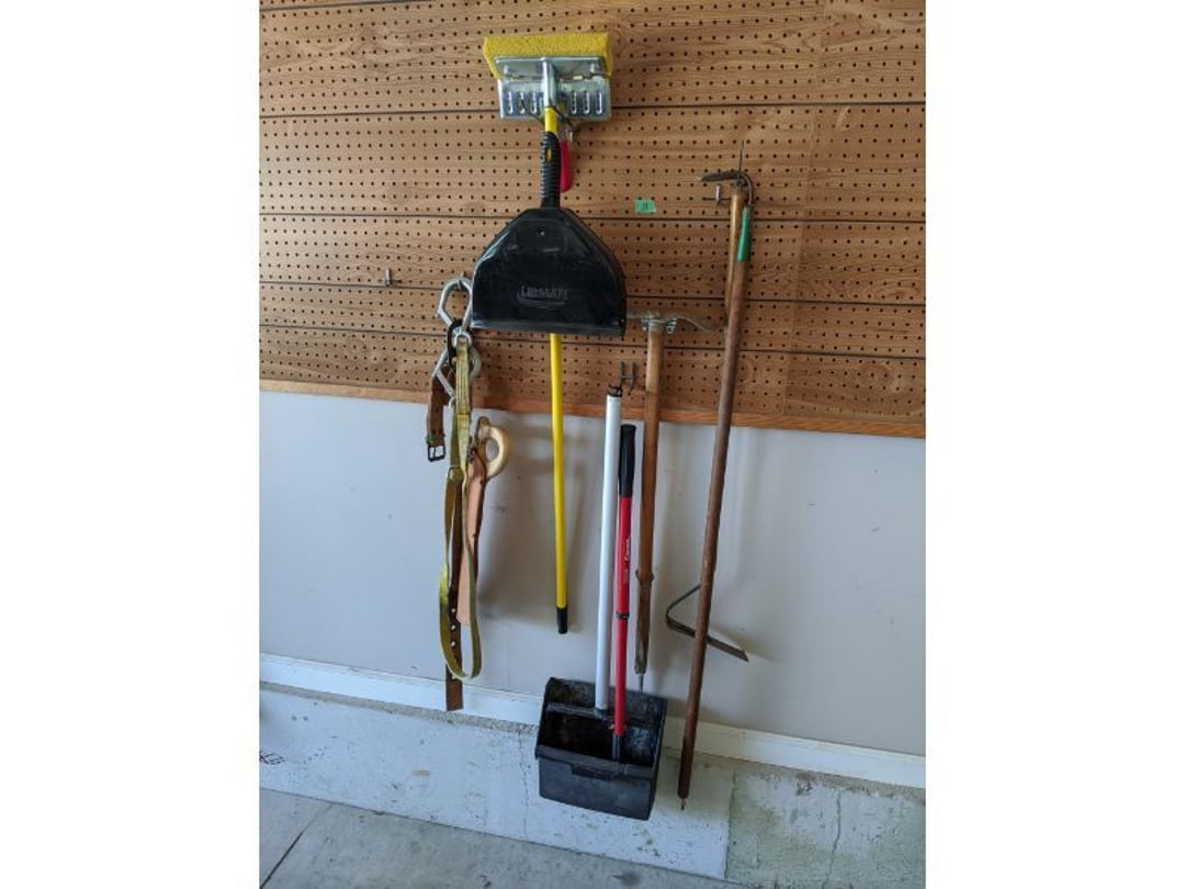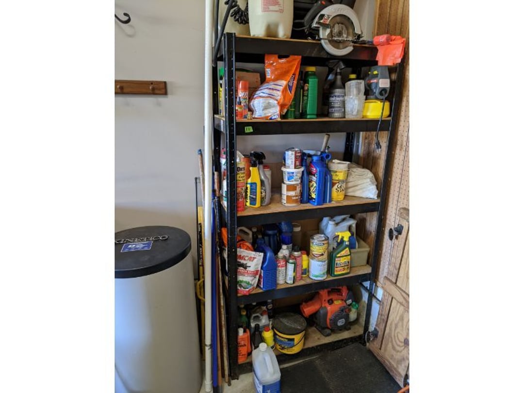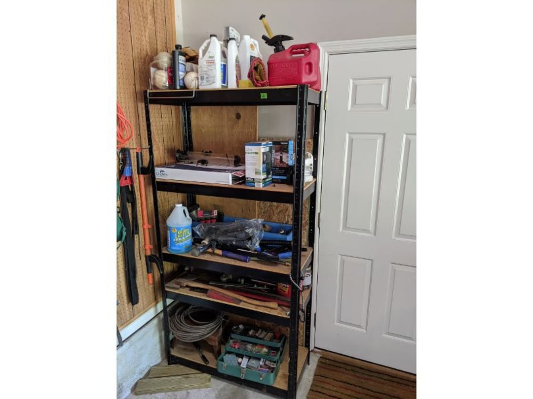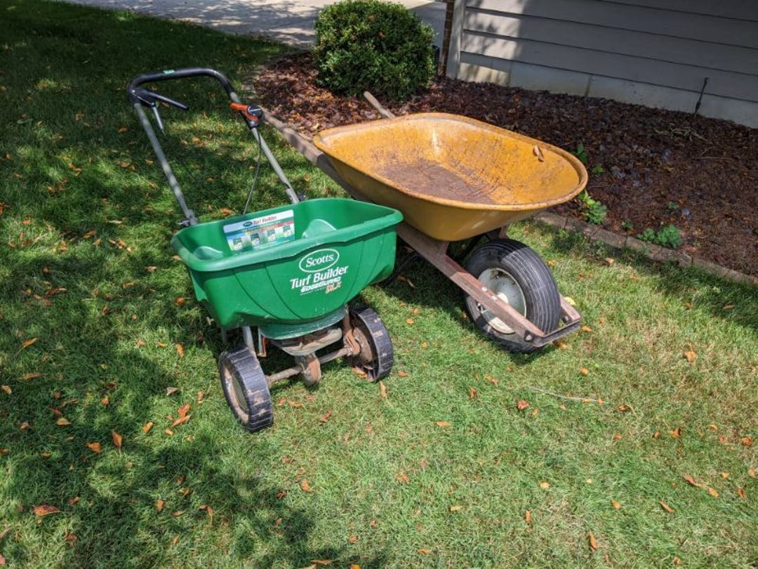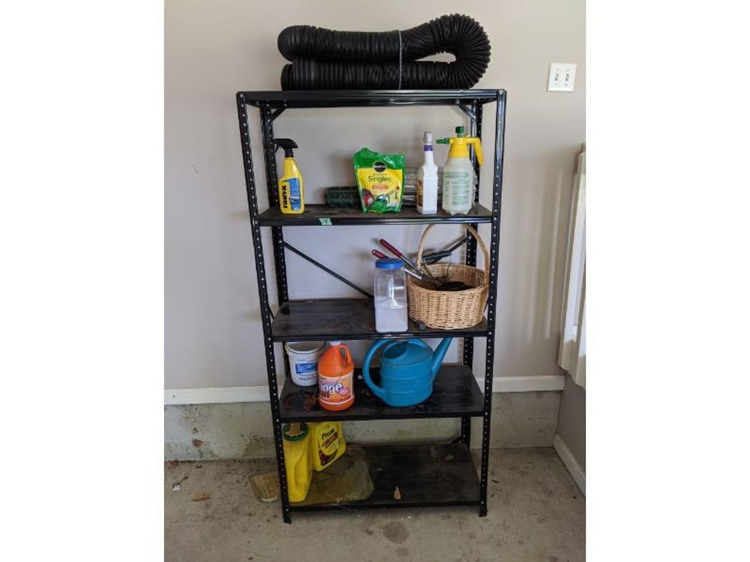 •Lawn & Garage Supply - Wheelbarror & Seed / Fertilizer Broadcast Spreader - Steel Shelf Full of Garage and Lawn Supply